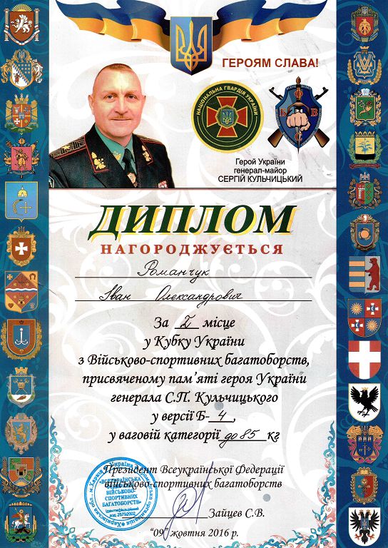 У м. Одеса відбувся Кубок України з Військово-спортивних багатоборств, присвячений пам’яті героя України генерала С. П. Кульчицького. Участь у заході взяли понад 200 спортсменів із 17 областей України, які є представниками Національної гвардії України, Міністерства внутрішніх справ України, Міністерства оборони України тощо. Серед учасників змагань був і представник Харківського національного університету внутрішніх справ ‒ курсант 4-го курсу факультету №1 Іван Романчук.