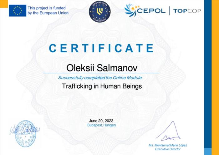 Курс був розроблений спеціально для органів досудового розслідування, які спеціалізуються на розслідуванні злочинів проти волі, честі та гідності особи на національному або транскордонному рівні. Курс дав зрозуміти поняття торгівлі людьми в більш широкому сенсі, оскільки вона впливає на країни-члени ЄС, включаючи її характеристики та підходи й стратегії, що використовуються для боротьби з нею співробітниками правоохоронних органів та їх партнерами. За результатами навчання Олексій Салманов успішно склав тест та отримав сертифікат.
