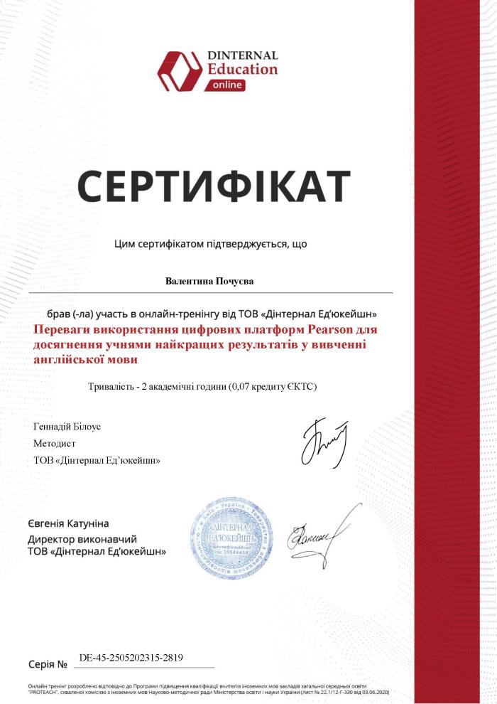 Доцентка кафедри іноземних мов факультету № 4 Валентина Почуєва взяла участь у Міжнародному онлайн-тренінгу «Переваги використання цифрових платформ Pearson для досягнення учнями найкращих результатів у вивченні англійської мови» від Міжнародного освітнього центру Dinternal Education.