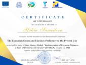 Доцентка кафедри гуманітарних дисциплін Сумської філії ХНУВС Юлія Самойлова взяла участь у Міжнародній науковій конференції «Європейський Союз і Україна: передісторія, історія, сучасність», яка відбулася на базі Чорноморського національного університету імені Петра Могили. Конференція пройшла в межах реалізації міжнародного проєкту Еразмус+ за напрямом Модуль Жана Моне «Імплементація європейських цінностей як базис демократії в Україні».