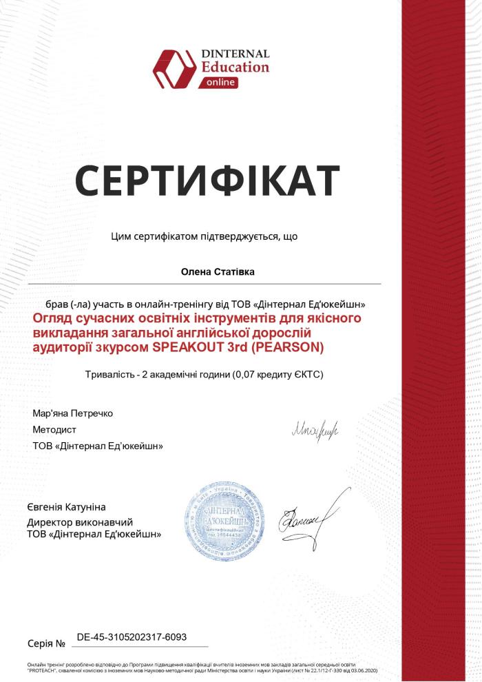 Завідувачка кафедри іноземних мов факультету № 4 ХНУВС Олена Статівка взяла участь у Міжнародному онлайн-тренінгу «Огляд сучасних освітніх інструментів для якісного викладання загальної англійської дорослій аудиторії з курсом Speakout 3rd (PEARSON)» від Міжнародного освітнього центру Dinternal Education.