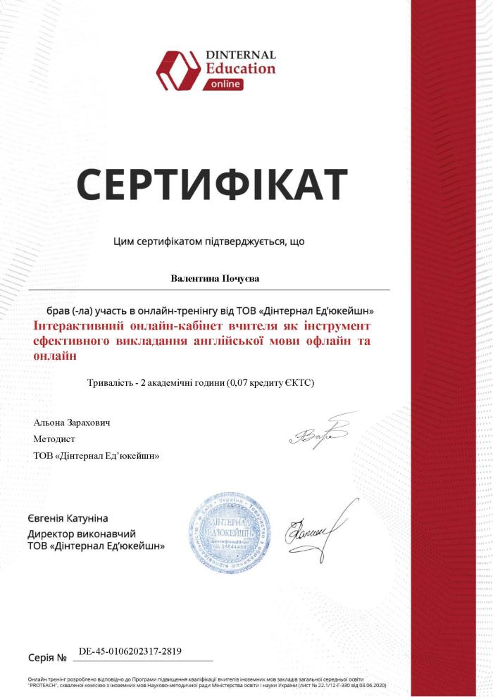 Доцентка кафедри іноземних мов факультету № 4 ХНУВС Валентина Почуєва взяла участь у Міжнародному онлайн-тренінгу «Інтерактивний онлайн-кабінет вчителя як інструмент ефективного викладання англійської мови офлайн та онлайн» від Міжнародного освітнього центру Dinternal Education.