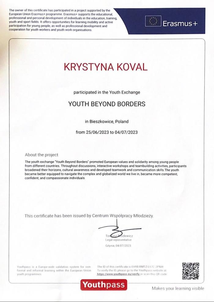 Курсантка 3 курсу факультету № 1 Харківського національного університету внутрішніх справ Кристина Коваль взяла участь у міжнародному молодіжному обміні «Youth Beyond Borders» у с. Бєшковіце та м. Гданськ (Республіка Польща) у межах проєкту Erasmus+. У заході взяли участь представники України, Королівства Іспанія, Королівства Швеція, Республіки Польща та Грецької Республіки. Мета заходу – популяризація європейських цінностей та солідарності серед молоді з різних країн, обговорення теми сучасного радикалізму в соціальних мережах, розвиток критичного мислення, підвищення компетентності, вміння будувати діалог про можливі рішення зі стейкхолдерами (представниками/представницями громадських організацій, молодіжними працівниками та працівницями, чиновниками та чиновницями).