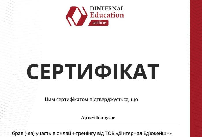 Викладач кафедри іноземних мов факультету № 4 ХНУВС Артем Білоусов взяв участь у Міжнародному онлайн-тренінгу «MyGRAMMARLab: Інноваційний інструмент для викладання та вивчення граматики англійської мови» від Міжнародного освітнього центру Dinternal Education. На тренінгу розглядалися сучасні способи викладання та вивчення граматики онлайн: перевернутий клас, відеоуроки, розвиток відповідальності студентів, ефективні вправи на контрольоване відпрацювання граматики в режимі онлайн, унікальні можливості платформи MyGrammarLab для гарантованого оволодіння граматикою студентами (рівні A2-C2). За результатами тренінгу Артем Білоусов набув досвіду з ефективного використання онлайн засобів для викладання граматики, враховуючи потреби дорослої аудиторії, та отримав сертифікат учасника.
