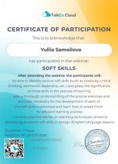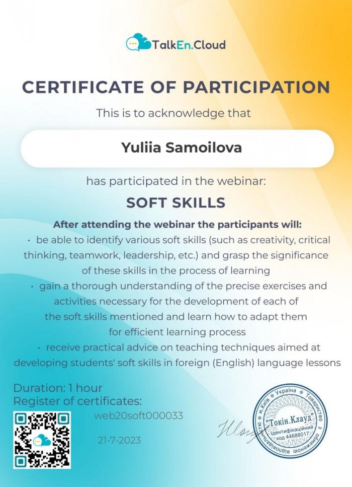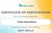 Доцентка кафедри гуманітарних дисциплін Юлія Самойлова стала учасницею вебінару від тренінгового центру TalkEn.Cloud на тему «Soft skills». Тема є надзвичайно актуальною, адже сучасні молоді фахівці, щоб бути успішними, повинні мати не лише спеціальні вузькопрофесійні знання, а й так звані «м’які навички», які є універсальними та дозволяють швидко адаптуватися до нових умов, вирішувати нестандартні завдання.