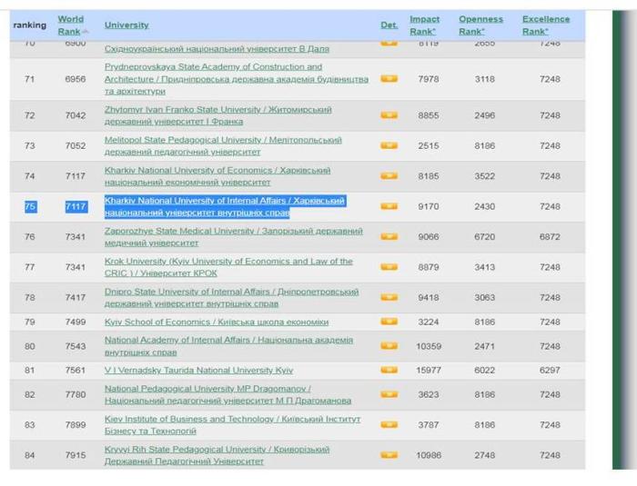 За результатами рейтингу ХНУВС посів 75 місце серед українських університетів і це найкращий результат серед ЗВО МВС, що готують поліцейських.