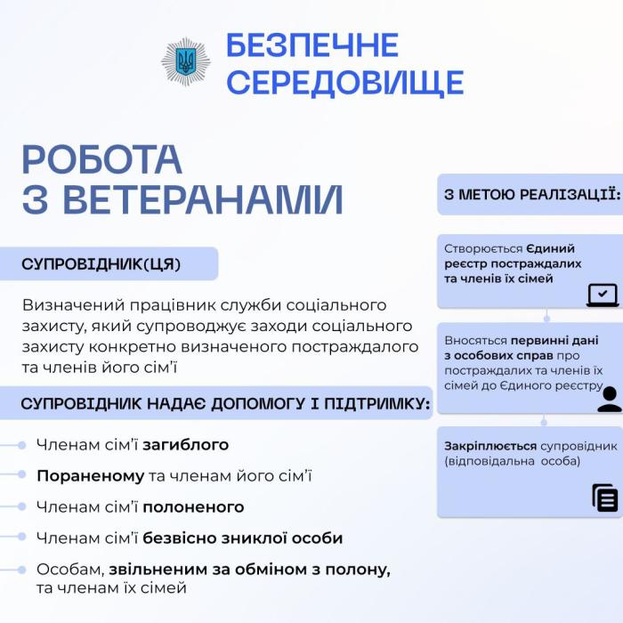 «Робота із ветеранами» - невід'ємна складова масштабного проєкту МВС під назвою «Безпечне середовище», що реалізується у межах Української доктрини, анонсованої Президентом України.