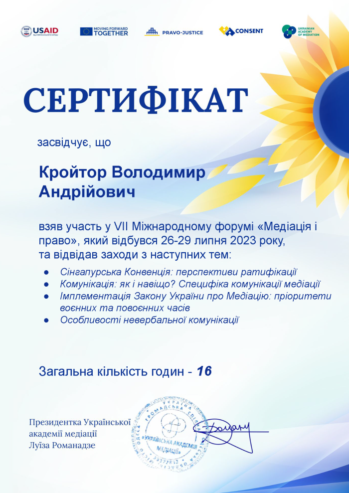 Професор кафедри цивільного права та процесу факультету № 6 Володимир Кройтор взяв участь у VII Міжнародному форумі «Медіація і право», що відбувся на платформі ZOOM. Він відвідав заходи з наступних тем: «Сінгапурська Конвенція: перспективи ратифікації»; «Комунікація: як і навіщо? Специфіка комунікації медіації»; «Імплементація Закону України про Медіацію: пріоритети воєнних та повоєнних часів»; «Особливості невербальної комунікації». За результатами участі у міжнародному форумі отримано сертифікат.