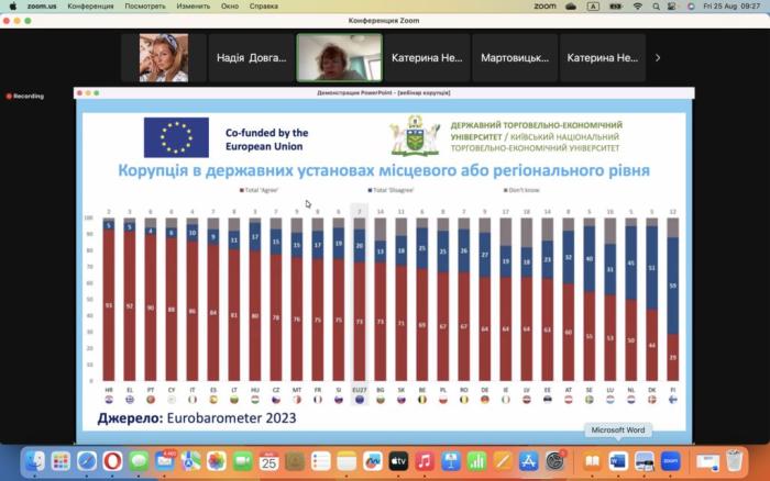 Професорка кафедри теорії та історії держави і права Юлія Загуменна взяла участь у вебінарі «Уроки антикорупційної політики ЄС для сталого розвитку громадянського суспільства України». Під час вебінару було розглянуто особливості антикорупційної політики Європейського Союзу, визначено пріоритетні напрями національної антикорупційної політики у світлі євроінтеграційних процесів, розвитку громадянського суспільства та повномасштабної війни.