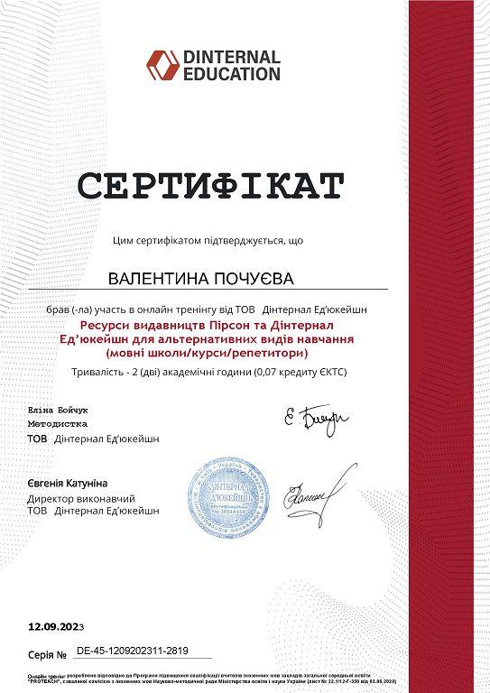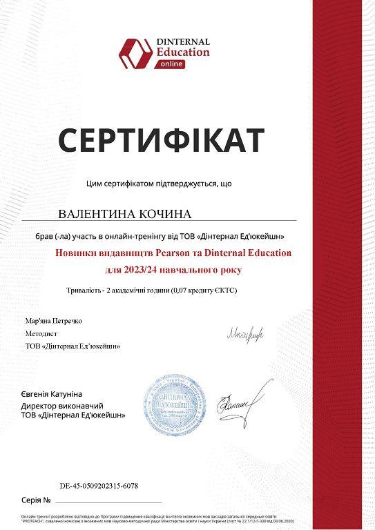 Доцентка цієї ж кафедри Валентина Кочина взяла участь в онлайн-вебінарі «Новинки видавництв Pearson та Dinternal Education для 2023/24 навчального року», де ознайомилася із сучасними автентичними ресурсами для викладання англійської мови з Disney Stars and Friends, Rise and Shine, з комунікативним підходом до викладання граматики GRAMMAR IN FOCUS А2+ та ресурсним забезпеченням для онлайн та офлайн навчання дорослих слухачів з курсом SPEAKOUT 3RD EDITION. Викладачка удосконалила навички імплементування сучасних методів навчання в традиційному, змішаному та дистанційному форматах.