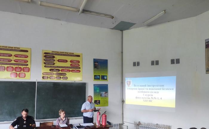 Інспектор протипожежної безпеки служби відділу матеріально-технічного забезпечення Харківського національного університету внутрішніх справ Юрій Чухрій та провідний спеціаліст із питань охорони праці Світлана Гетьманцева провели для першокурсників факультетів № 1 та № 4 інструктаж з протипожежної безпеки та охорони праці. Юрій Чухрій ознайомив курсантів з основними правилами пожежної безпеки, нагадав вимоги пожежної безпеки в побуті, роз’яснив алгоритм дій у випадку виникнення пожежі в приміщенні, а також продемонстрував як користуватися первинними засобами пожежогасіння, зокрема вогнегасниками. Молоді також розповіли про вибухонебезпечні предмети та правила поведінки у разі їх виявлення.