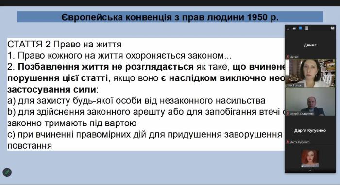 Старшим викладачем кафедри юридичних дисциплін Сумської філії ХНУВС Андрієм Сядристим разом із завідуючою сектором муніципального права та місцевого самоврядування Науково-дослідного інституту державного будівництва та місцевого самоврядування, доцентом кафедри конституційного і муніципального права юридичного факультету Харківського національного університету імені В.Н. Каразіна, кандидатом юридичних дисциплін Лілією Гришко було проведено бінарне заняття для студентів 2 курсу денної форми навчання за спеціальністю «Правоохоронна діяльність» із дисципліни «Забезпечення прав людини у правоохоронній діяльності». Тема – «Міжнародно-правові стандарти забезпечення прав людини у правоохоронній діяльності».