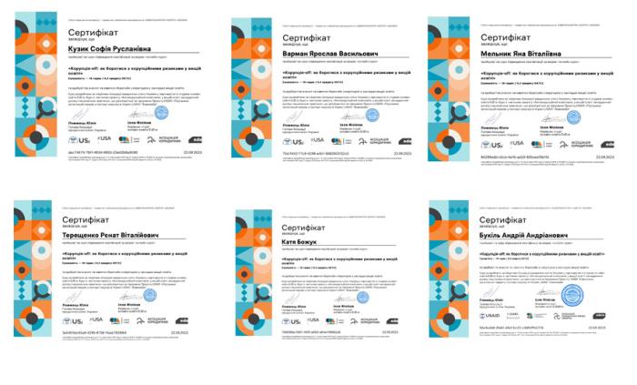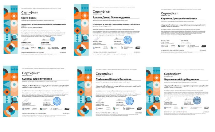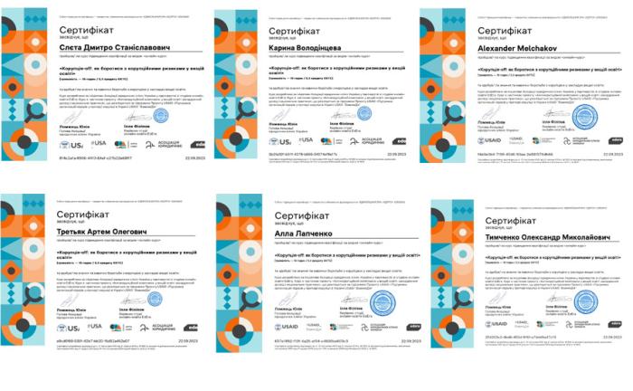 Професорка кафедри теорії та історії держави і права факультету № 1 Юлія Загуменна та курсанти навчальної групи 2 курсу факультету № 1 у межах кураторської роботи успішно пройшли онлайн-курс «Корупція-off: як боротися з корупційними ризиками у вищій освіті» на освітній платформі EdEra. Курс є частиною проєкту «Антикорупційний комплаєнс у вищій освіті: закордонний досвід і національна практика», що реалізується за підтримки Проєкту USAID «Підтримка організації-лідерів у протидії корупції в Україні USAID «ВзаємоДія»».