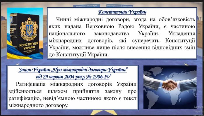 Представники кафедри конституційного і міжнародного права факультету № 4 – професор кафедри Андрій Войціховський та викладач кафедри Вадим Мальцев – взяли участь у тематичній онлайн-лекції суддів Конституційного Суду України Галини Юровської та Віктора Городовенка на тему «Застосування практики Європейського суду з прав людини Конституційним Судом України».