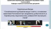 Завідувачка кафедри соціально-економічних дисциплін Сумської філії ХНУВС Олена Лук’янихіна і доцентка кафедри Людмила Парфентій провели кураторську бесіду «Ознайомлення здобувачів вищої освіти з основними вимогами Положення про академічну доброчесність в Харківському національному університеті внутрішніх справ» зі студентами-першокурсниками спеціальності «Право».