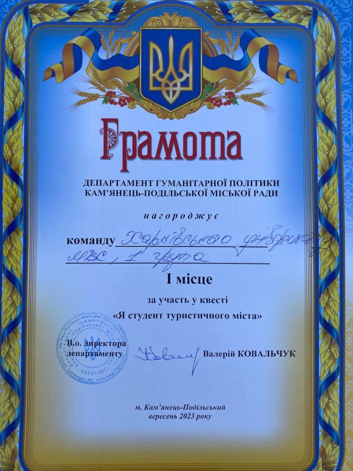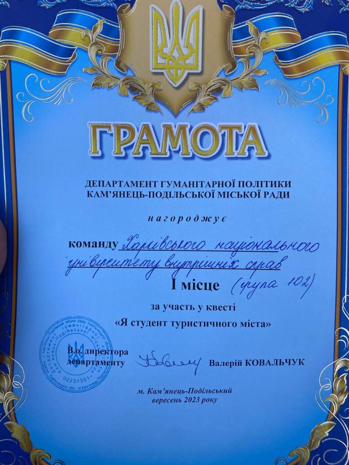 Для курсантів перших курсів факультетів № 1 та № 4 ХНУВС було організовано культурно-освітній захід «Я студент туристичного міста» за сприяння відділу соціально-гуманітарної роботи та за ініціативи департаменту гуманітарної політики міської ради м. Кам'янець-Подільський. Під час екскурсій, мета яких – бережливе ставлення до історичної спадщини, здобувачі вищої освіти ознайомилися з історією міста та його унікальними пам'ятками. Місто розташоване на мальовничих берегах річки Смотрич, славиться своєю красою, давньою архітектурою і легендарним замком. Наприкінці кожної екскурсії курсанти брали участь у цікавих історичних квестах та ставали переможцями серед команд навчальних закладів Кам'янця-Подільського.