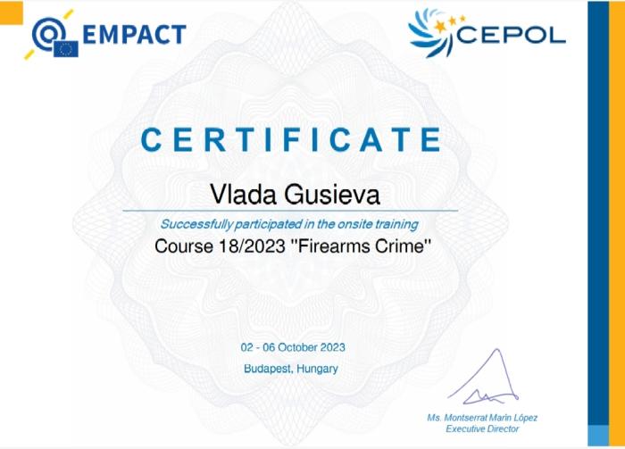 Професор кафедри криміналістики, судової експертології та домедичної підготовки факультету № 1 Харківського національного університету внутрішніх справ доктор юридичних наук, професор, майор поліції Влада Гусєва взяла участь у тренінговому циклі «Firearms Crime». Захід організований Агентством Європейського Союзу з підготовки співробітників правоохоронних органів (CEPOL) у м. Будапешт (Угорщина).
