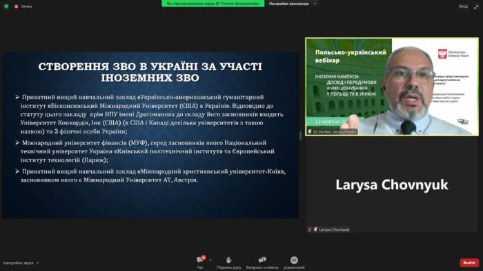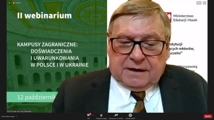 Захід відкрив президент Фундації польських ректорів Єжи Вожніцкі. В процесі вебінару були розглянуті такі питання: нормативно-правові підстави та практика щодо правових умов і обмежень для відкриття у Польщі іноземних закладів вищої освіти та їхніх філій, а також щодо права польських ЗВО надавати освітні послуги за межами Польщі; правовий статус, можливості та обмеження для відкриття філій іноземних університетів в Україні та форми діяльності і представництва українських ЗВО за кордоном.