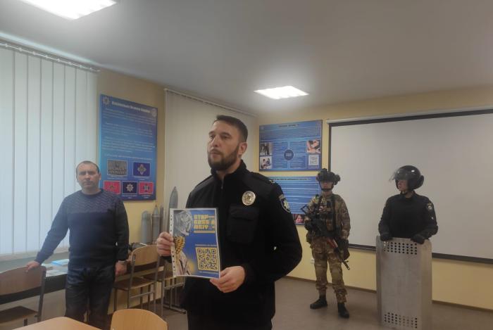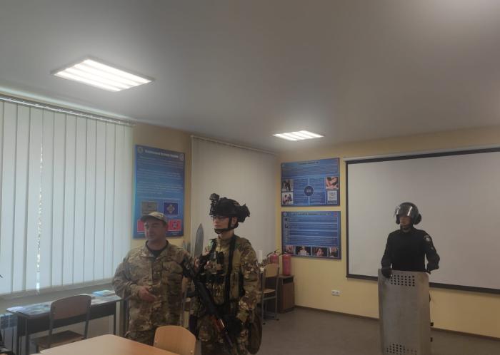 Старший викладач кафедри тактичної та спеціальної підготовки факультету № 3 Володимир Євтушок продемонстрував макети різних видів зброї, вибухонебезпечних предметів та боєприпасів, а також екіпіровку поліцейського при виконанні спеціальних завдань.