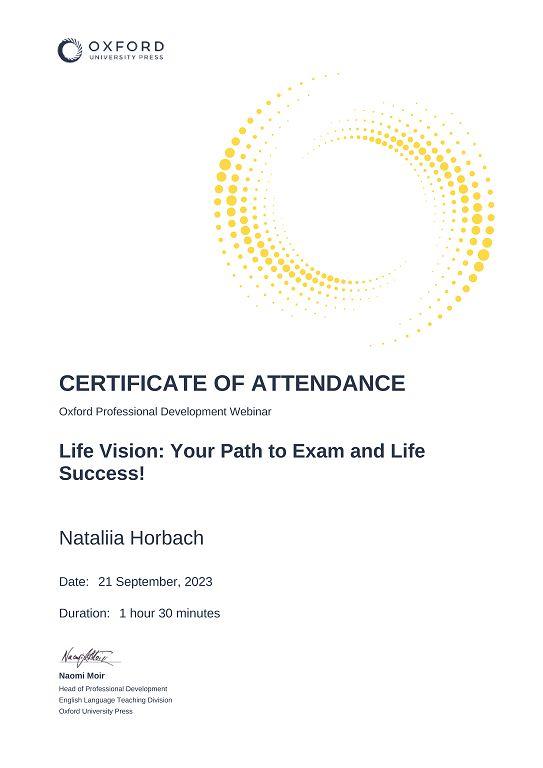 Старша викладачка кафедри Наталія Горбач взяла участь у Міжнародному онлайн-вебінарі «Life Vision: Your Path to Exam and Life Success!» від Oxford University Press та ознайомилася з можливостями навчального курсу, який допомагає студентам набути мовних навичок, необхідних для успішного складання іспиту. Наталія Горбач також розглянула відеоматеріали та запропоноване вивчення граматики й лексики, що відповідає CEFR. За результатами участі у заходах викладачі кафедри отримали сертифікати.