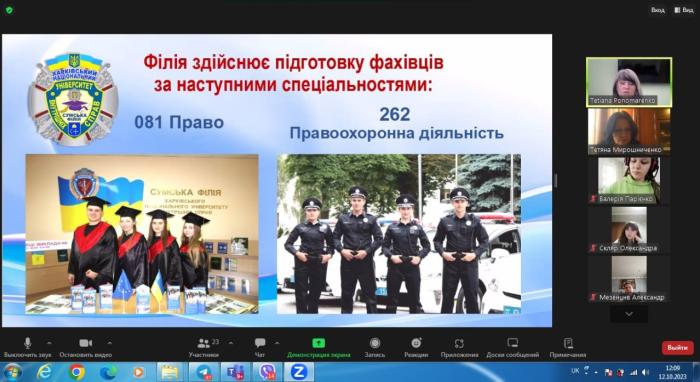 Під таким гаслом відбулася профорієнтаційна онлайн-бесіда з учнями Сумської загальноосвітньої школи № 5, яку провела доцентка кафедри гуманітарних дисциплін Сумської філії ХНУВС Тетяна Пономаренко. Вона презентувала спеціальності, за якими відбувається підготовка здобувачів вищої освіти у філії університету.