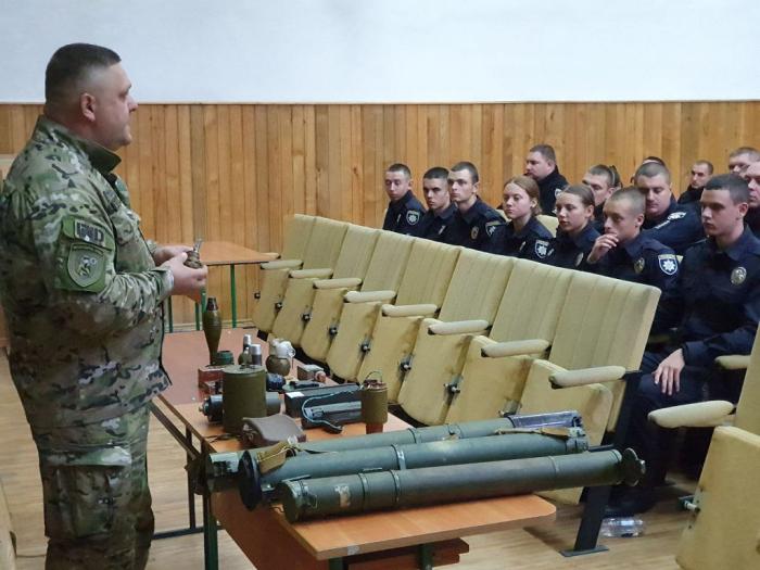 Під час заняття розглядалися питання: ідентифікація вибухових пристроїв, зокрема візуальні ознаки вибухонебезпечних предметів та пристроїв; класифікація вибухівки, тактико-технічні характеристики гранат і мін. Курсантам продемонстрували макети вибухових пристроїв та засобів ураження (міни, гранати, РПГ тощо). Особливу увагу приділили діям поліцейського при виявленні вибухових речовин чи пристроїв.