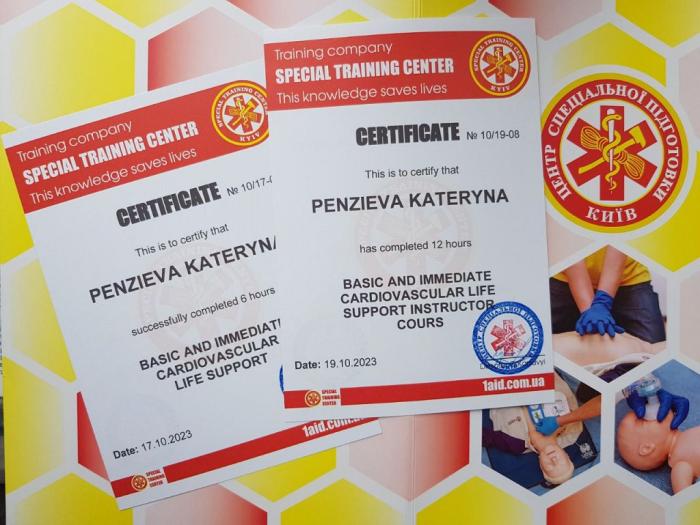 Представниця кафедри пройшла підготовку на курсі «Домедична допомога при раптовій зупинці серця та загрозливих життю станах», що проводили інструктори Тренінгової компанії «Центр Спеціальної Підготовки». Учасники курсу поглибили та отримали нові знання, опанували практичні навички з оцінки стану свідомості, проведення серцево-легеневої реанімації, зокрема з використанням автоматичного зовнішнього дефібрилятора, покращили вміння, які необхідні для надання першої допомоги постраждалим з критичною кровотечею, особам у невідкладних станах, викликаних порушенням дихання та кровообігу. Також Катерина Пензєва прослухала курс з підготовки інструкторів, готових до швидких та ефективних дій у надзвичайних ситуаціях, здатних ініціювати та проводити навчальні заняття з базової медичної допомоги у навчальних закладах.