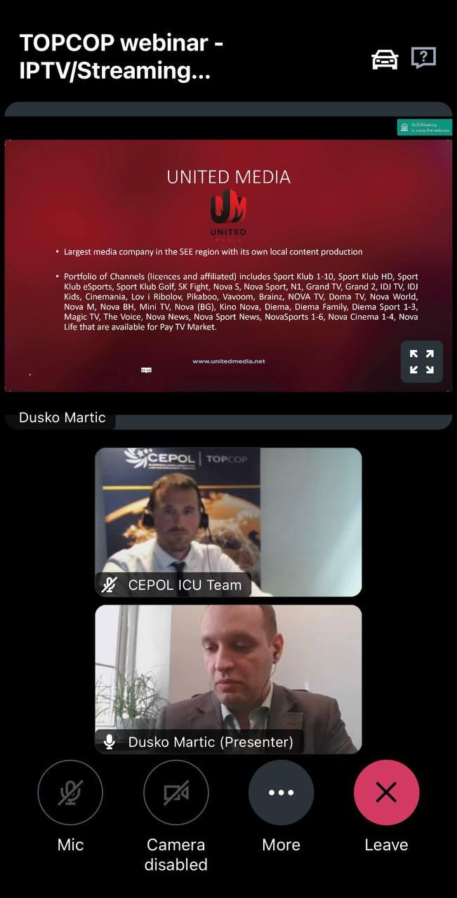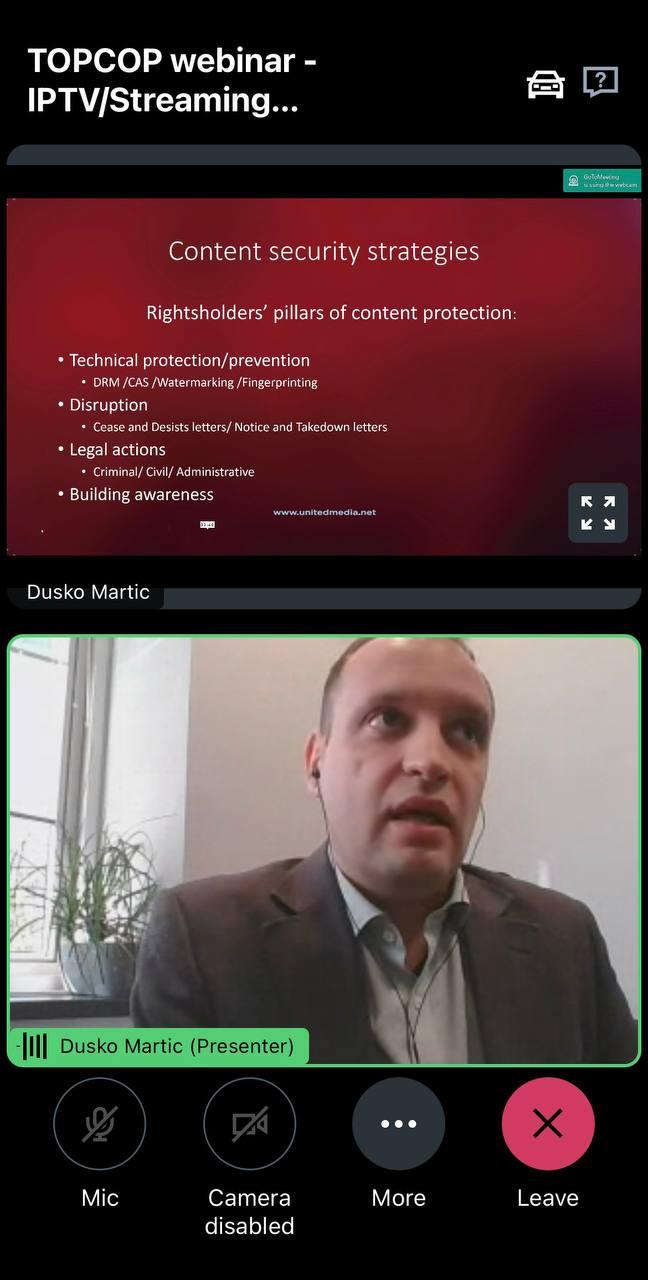Під час заходу експерт з Європолу Олександар Велев виступив із доповіддю на тему «Сучасний стан піратства потокового медіа та основні види порушень IPTV у цій сфері» (Streaming media piracy current landscape and main types of IPTV infringements in this field), експерт ринку відео-телебачення Душко Мартич розповів про «Методи та інструменти міжнародної співпраці для протидії подібним явищам» (International cooperation methods and tools to counter similar phenomena).