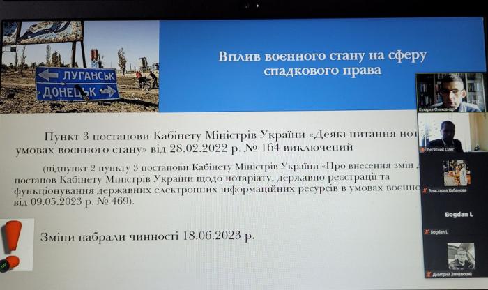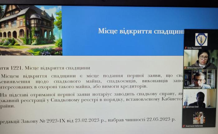 В юридичній клініці факультету № 6 Харківського національного університету внутрішніх справ відбувся онлайн-семінар з актуальних питань спадкування в умовах воєнного стану в Україні. В семінарі взяв участь професор кафедри цивільного права та процесу, доктор юридичних наук, професор Олександр Кухарєв. Він розповів про зміни в чинному законодавстві, які необхідно враховувати спадкодавцям за життя та спадкоємцям. Під час семінару обговорювались питання строку для відкриття спадщини, оформлення відкриття спадщини, місце відкриття спадщини, можливість подання заяви про прийняття спадщини за кордоном, посвідчення заповітів посадовими та службовими особами тощо. Куратори юридичної клініки Елла Твердохліб і Тетяна Кириченко запропонували консультантам розглянути практичні приклади звернення громадян із питань спадкування та звернули увагу на особливості кожного випадку, які слід враховувати під час надання правової допомоги громадянам. Консультанти юридичної клініки взяли активну участь в обговоренні питань семінару та практичних прикладів.