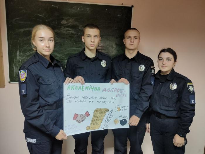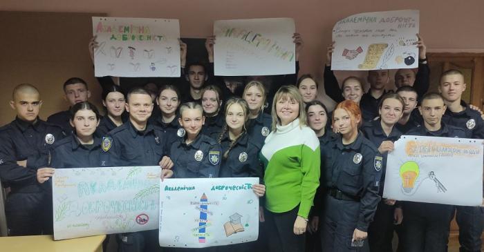 Для курсантів навчальної групи факультету № 3 доценткою кафедри педагогіки та психології Вікторією Доценко було проведено перший з трьох запланованих семінар-тренінгів, мета яких – формування мотивації неухильного дотримання доброчесності для забезпечення ефективності навчальної і дослідницької діяльності здобувачів вищої освіти, розвиток навичок якісного академічного письма.