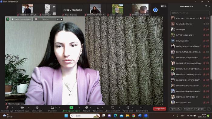 Старший інспектор відділу зв’язків з громадськістю управління патрульної поліції в Харківській області капітан поліції Артем Лихоманов і старша викладачка кафедри кримінального права та кримінології факультету № 6 Юлія Митрофанова провели бінарне заняття для студентів факультету № 6 із навчальної дисципліни «Кримінальне право».