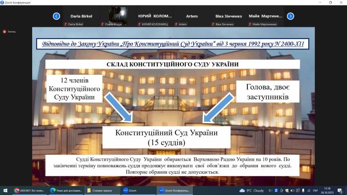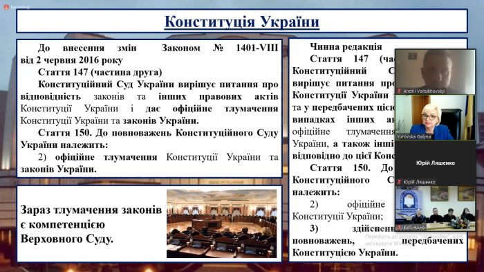 Представники кафедри конституційного і міжнародного права факультету № 4 – завідувачка кафедри Тетяна Гудзь і професор кафедри Андрій Войціховський, а також професор кафедри фундаментальних та юридичних дисциплін факультету № 6 Юрій Коломієць взяли участь у черговій тематичній лекції на тему «Історія заснування Конституційного Суду України».