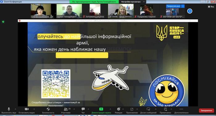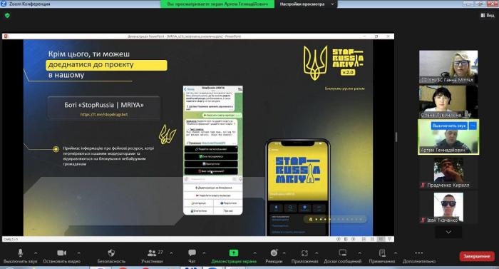 На початку заходу старший інспектор з особливих доручень відділу протидії кіберзлочинам у Сумській області Департаменту кіберполіції Національної поліції України, майор поліції Артем Бухтіаров розповів про проєкт «MRIYA» #СтаньВоїномКіберфронту. Цілями проєкту https://mriya.social є: знищення російських осередків в Інтернеті; зменшення рівня булінгу та цькування в мережі; протидія наркотикам та шахрайству; навчання й тренінги з кібергігієни; просвіта населення щодо інформаційної гігієни; залучення та мотивація громадян до активної громадянської позиції.