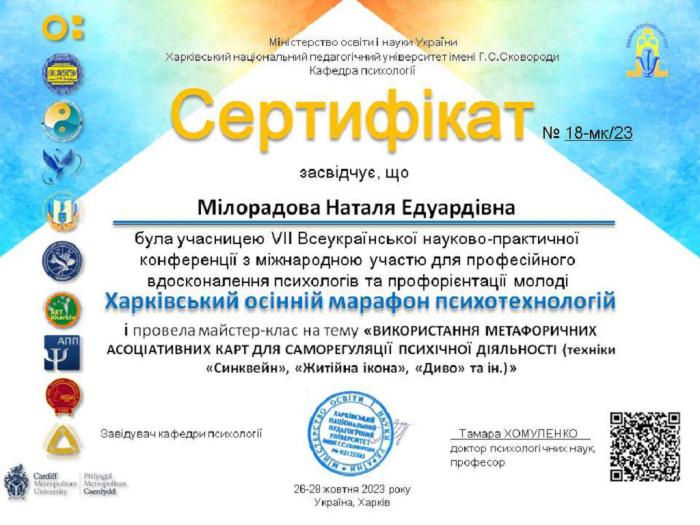 Професорка кафедри педагогіки та психології докторка психологічних наук, професорка Наталя Мілорадова, професорка кафедри соціології та психології Ірина Нечітайло та старша викладачка цієї ж кафедри Надія Чепелєва взяли участь у роботі VІІ Всеукраїнської науково-практичної конференції з міжнародною участю для професійного вдосконалення психологів та профорієнтації молоді «Харківський осінній марафон психотехнологій».