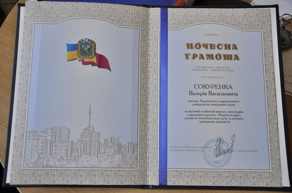 За вагомий особистий внесок у реалізацію соціального проекту «Кадети поліції», розвиток волонтерського руху та активну громадську діяльність ректора Харківського національного університету внутрішніх справ Валерія Сокуренка нагороджено Почесною грамотою Харківської державної обласної адміністрації. Викладачів університету, які брали участь в навчальному процесі кадетів, нагороджено Подяками Харківської державної обласної адміністрації.