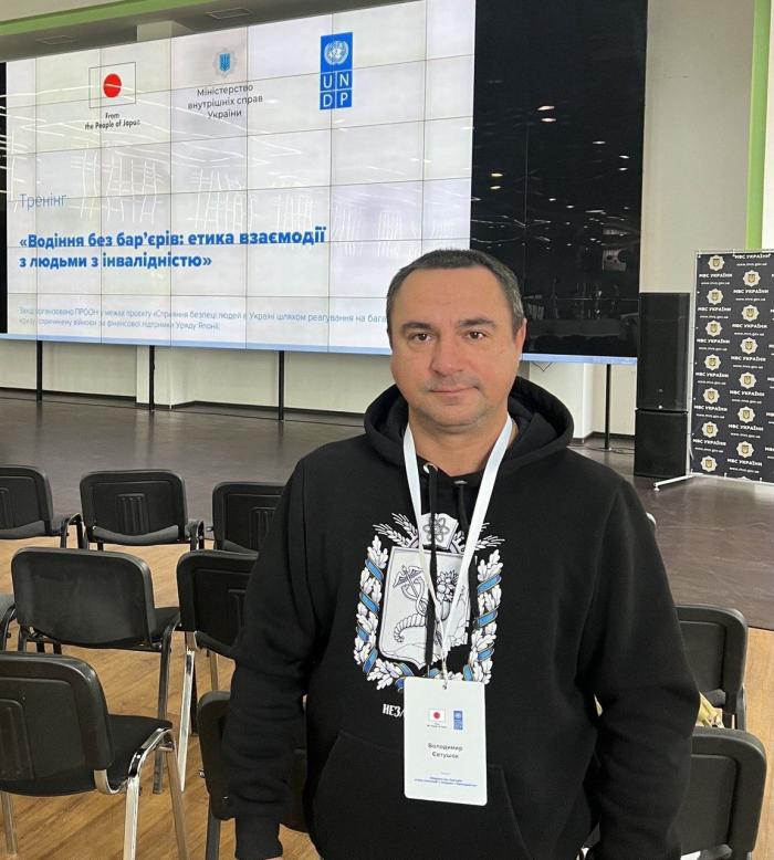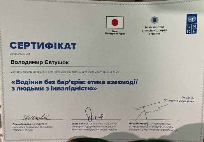 Старший викладач кафедри тактичної та спеціальної фізичної підготовки факультету № 3 Харківського національного університету внутрішніх справ підполковник поліції Володимир Євтушок та інструктор з водіння Іван Бондаренко пройшли тренінг «Водіння без барʼєрів: етика взаємодії з людьми з інвалідністю», організований у межах проєкту Програми розвитку Організації Об’єднаних Націй в Україні «Сприяння безпеці людей в Україні шляхом реагування на багатовимірну кризу, спричинену війною» за фінансової підтримки Уряду Японії.