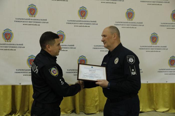 За участь у конкурсі на кращу наукову, науково-технічну та профорієнтаційну продукцію в апараті МВС, територіальних органах, закладах, установах і підприємствах, що належать до сфери управління Міністерства внутрішніх справ Дипломом І ступеня у номінації «Винаходи, корисні моделі, промислові зразки» відзначено патент на корисну модель «Спосіб екранування кабелів радіоелектронної апаратури для здійснення їх гарантованого захисту від впливу потужного електромагнітного випромінювання ультракороткої тривалості» (автори Сотніков О.М., Танцюра О.Б., Носов В.В., Манжай О.В.). Нагороду отримав завідувач кафедри протидії злочинності кандидат юридичних наук, професор, підполковник поліції Олександр Манжай.