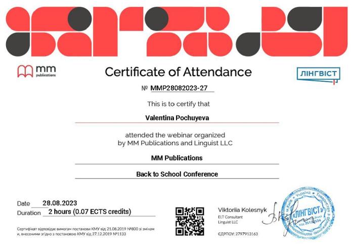 Доцентка кафедри іноземних мов факультету № 4 Валентина Почуєва та старша викладачка цієї ж кафедри Лариса Сазанова відвідали онлайн-вебінар «Back to School Conference», організований MM Publications та Linguist LLC. Міжнародні спікери-тренери, викладачі з багаторічним досвідом, які є редакторами підручників MM Publications, провели сесії для викладачів стосовно роботи з навчальною літературою. Валентина Почуєва та Лариса Сазанова пройшли вікторину кваліфікації та отримали сертифікати учасника.