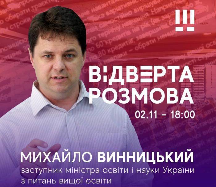 Основні питання, що були розглянуті під час «Відвертої розмови», стосувалися реформування вищої освіти. Михайло Вінницький відповів на багато запитань щодо трансформації заочної освіти в дистанційну, скорочення кількості навчальних закладів шляхом їх об’єднання й укрупнення, особливостей запровадження грантового фінансування чи співфінансування освіти та багато інших.