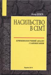 Монографія присвячена комплексному аналізу насильства в сім’ї. Здійснено історичний і порівняльний аналіз сім’ї та насильства в сім’ї в українському суспільстві як соціально-нравових явищ, розглянуті проблеми визначення поняття та змісту насильства в сім’ї. Здійснений кримінологічний аналіз насильства в сім’ї, в рамках якого розкриті кількісно-якісні показники насильства в сім’ї, наведена кримінологічна характеристика осіб, які вчинили насильство в сім’ї, та потерпілих від цього явища. Розроблена кримінологічна характеристика злочинів, що пов’язані з проявами фізичного, психологічного, економічного та сексуального насильства в сім’ї. Окремо наведені криміногенні чинники насильства в сім’ї макрорівня, мезорівня та мікрорівня. Розкрита вітчизняна система запобігання насильству в сім’ї та запропоновані напрямки її удосконалення.