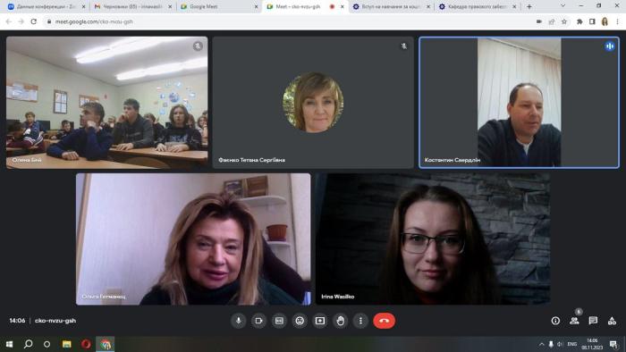 Деканеса факультету № 6 Оксана Брусакова, заступник декана Костянтин Свердлін, завідувачка кафедри правового забезпечення підприємницької діяльності та фінансової безпеки факультету № 6 Ольга Гетманець і доцентка кафедри Ірина Антол провели онлайн-зустріч на тему вступної компанії 2024 року з учнями випускних класів Опорного закладу Гребінківська загальноосвітня школа І-ІІІ ступенів № 4 Гребінківської міської ради Полтавської області. У заході взяли участь понад 30 учасників.