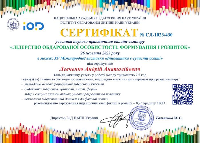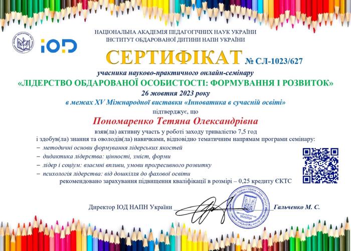 Доцентка кафедри гуманітарних дисциплін кандидатка філософських наук Сумської філії ХНУВС Тетяна Пономаренко та курсант 2 курсу Андрій Левченко взяли участь у роботі науково-практичного онлайн-семінару «Лідерство обдарованої особистості: формування і розвиток» в межах ХV Міжнародної виставки «Інноватика в сучасній освіті».