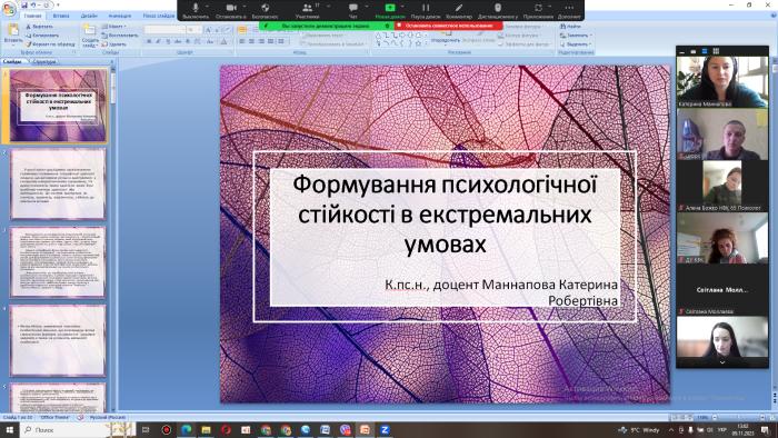 В інформаційному блоці Катерина Маннапова ініціювала дискусію щодо поняття життєстійкості та її складових, а також особливостей копінг-стратегій відповідно до провідного компоненту життєстійкості особистості. Під час практичного блоку учасники виконали вправи, що були спрямовані на підвищення життєстійкості в екстремальних умовах. Наприкінці зустрічі слухачі також отримали інформацію щодо особливостей вступу до магістратури Харківського національного університету внутрішніх справ.