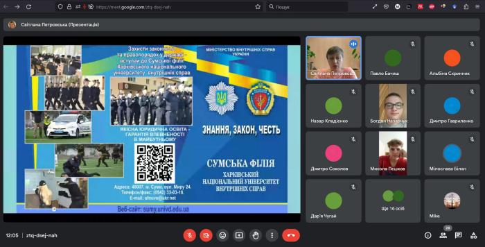 У межах профорієнтаційної роботи Сумської філії Харківського національного університету внутрішніх справ доцентка кафедри соціально-економічних дисциплін Світлана Петровська провела онлайн-зустріч з учнями 11-х класів Комунальної установи Сумська спеціалізована школа І-ІІІ ступенів № 1 ім. В. Стрельченка.