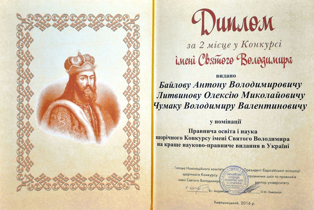 Євразійською асоціацією правничих шкіл та правників і Хмельницьким університетом управління та права проведено конкурс на присудження щорічної премії імені Святого Володимира за краще науково-правниче видання в Україні.