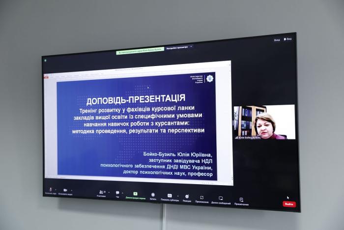Робочу нараду відкрив заступник директора Департаменту освіти, науки та спорту МВС України Вадим Пянковський, який зазначив, що від професійних знань та навичок працівників курсової ланки залежить ефективність взаємодії з курсантами, їх виховання та адаптація до нового соціального статусу. Заступниця завідувача науково-дослідної лабораторії психологічного забезпечення Державного науково-дослідного інституту МВС України Юлія Бойко-Бузиль виступила з доповіддю-презентацією на тему «Тренінг розвитку у фахівців курсової ланки закладів вищої освіти із специфічними умовами навчання навичок роботи з курсантами: методика проведення, результати та перспективи».