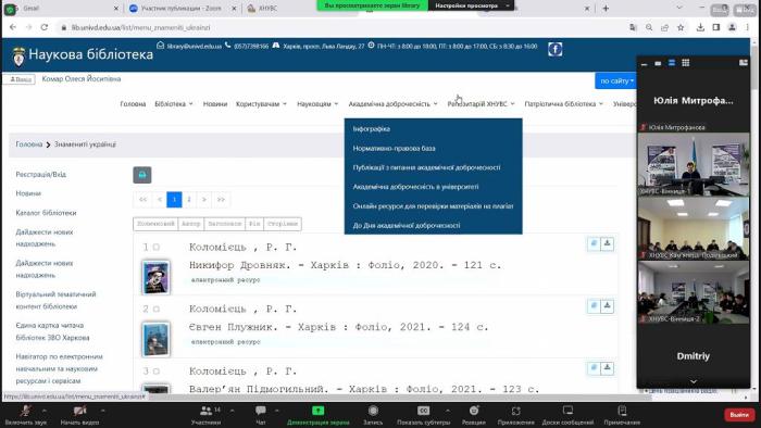 Під час заходу були розглянуті питання щодо формування особистого бренду науковця та роботи в бібліотечному порталі як єдиній точці доступу до електронних ресурсів наукової бібліотеки. Доповідачі розповіли про роботу в системі Google Scholar, ORCID та Репозитарії ХНУВС (KhNULAIR), висвітлили позиції, що надають можливості для більш зручного користування базами, розповіли про їх взаємозв’язок. Акцентували увагу на бібліотечному порталі та правилах, яких потрібно дотримуватися для швидкого пошуку необхідних видань. Розглянуто було питання й щодо антиплагіатних систем, таких як: Unichek, ADVEGO , Edu-Birde.