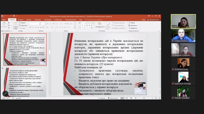 Анна Лисенко підготувала змістовну презентацію, відповіла на запитання щодо порядку проходження стажування, тестування та особливостей деяких нотаріальних дій, а також запросила студентів у майбутньому пройти виробничу практику в органах нотаріату.