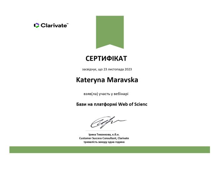 Учасники вебінару ознайомились з базами на платформі Web of Scienc, зокрема, Derwent Innovations Index, Регіональні індекси наукового цитування, MedLine, дізналися, чим вони можуть бути корисні науковцю. На сьогодні на платформі Web of Science розміщено 17 баз даних. Найчастіше працюють із Web of Science Core Collection. Після закінчення вебінару спікерка відповіла на запитання учасників. За результатами навчання представники університету отримали сертифікати.