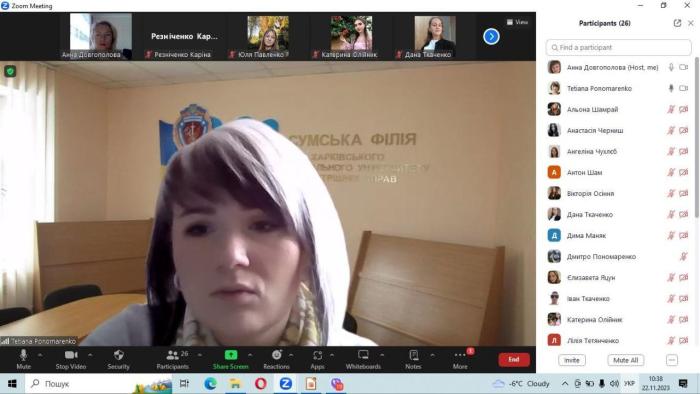 Відбулося чергове засідання студентсько-курсантського наукового гуртка «Veritas» кафедри гуманітарних дисциплін Сумської філії ХНУВС, яке провели доцентки кафедри Ганна Довгополова та Тетяна Пономаренко – керівниця гуртка. Тема засідання – «Міжкультурна комунікація в щоденній практиці правознавців». Здобувачі освіти поділилися науковими розвідками щодо сутності міжкультурної комунікації в професійній діяльності юристів, а також гендерних аспектів окресленої проблематики. Ганна Довгополова звернула увагу на важливості вивчення іноземної мови як обов’язкової умови для підготовки майбутніх правознавців до здійснення професійної діяльності.